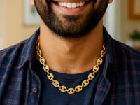 This puffed mariner link chain comes in 14k yellow gold and has a width of 9.00 millimeters.