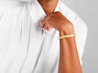 Exuding luxurious elegance, this 14k yellow gold ribbed cuff with beaded edging showcases a brilliant polished finish that catches and reflects light beautifully. Its gently ribbed surface adds subtle dimension, while its embellished edge lends a refined charm. Crafted from radiant gold, this bangle is designed to make a statement, and it’s a must-have piece that effortlessly elevates any look.
