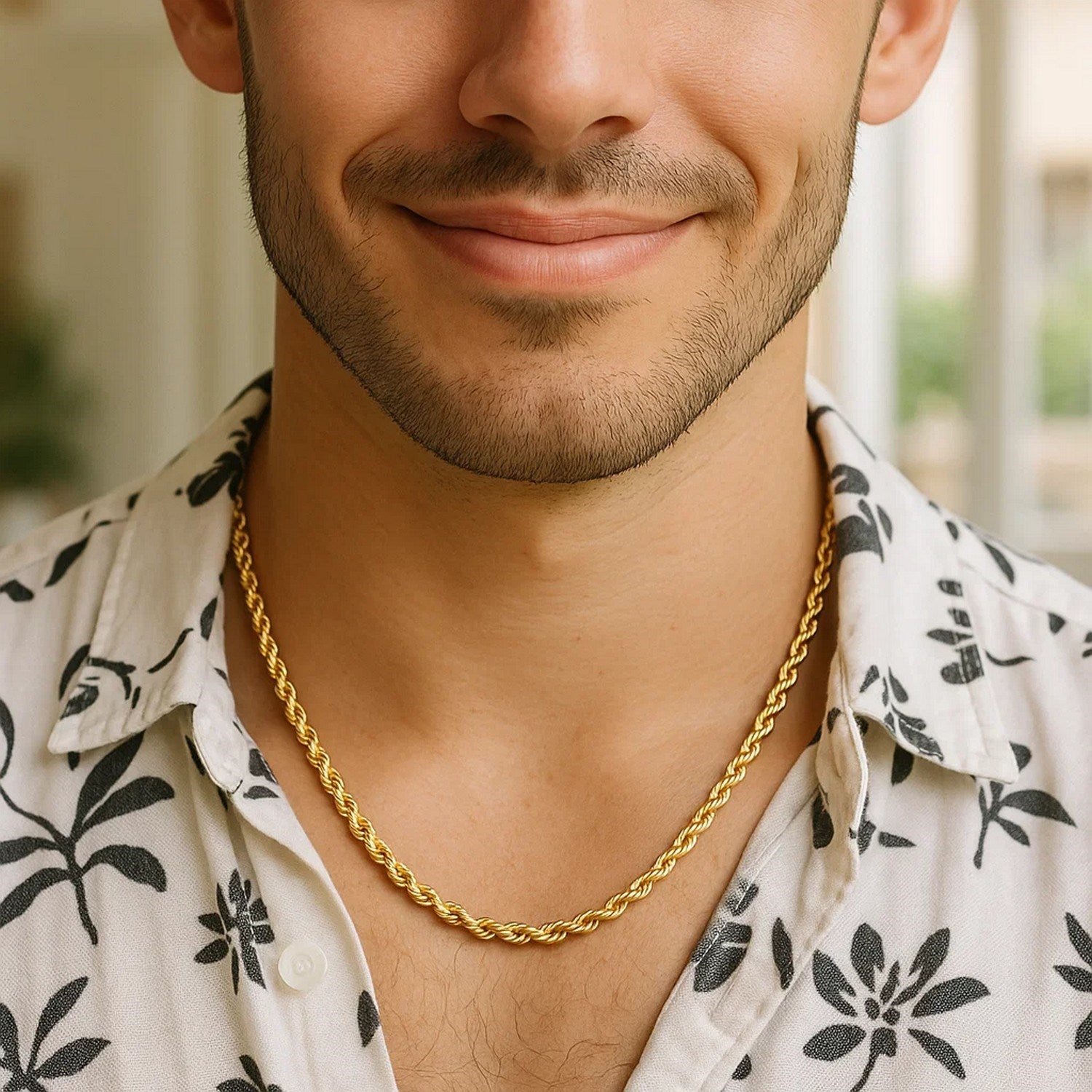 Crafted in sterling silver with a warm yellow gold plating, this 4.40 mm diamond-cut royal rope chain features intricately twisted links enhanced with faceted detailing that sparkles from every angle, offering a bold yet refined shine perfect for wearing alone or pairing with your favorite pendant.